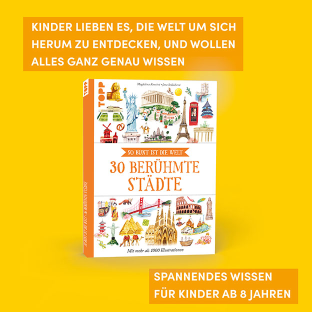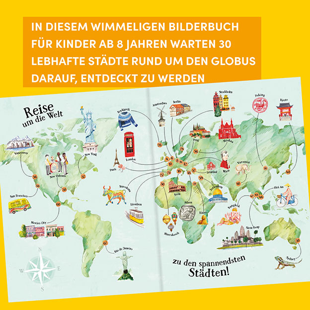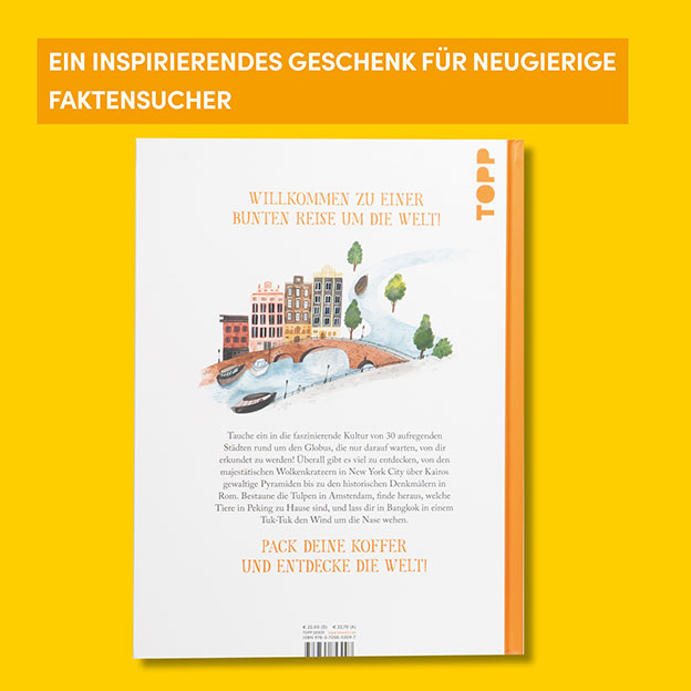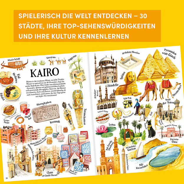 In diesem wimmeligen Bilderbuch für Kinder ab 8 Jahren warten 30 lebhafte Städte rund um den Globus darauf, entdeckt zu werden. Unzählige liebevolle Illustrationen erwecken die gewaltigen Pyramiden in Kairo, die geschäftigen Märkte Istanbuls oder den Karneval in Rio de Janeiro zum Leben und regen die Fantasie an. Kurze, unterhaltsame Texte geben eine Einführung in die Besonderheiten der Städte. Erkunde die Tempel Kyotos, geh auf Stadtrundfahrt in einem Tuk-Tuk und tanze zu Jazz in New Orleans! Jede Stadt hat ihre eigene Geschichte zu erzählen. Begib dich auf eine abenteuerliche Reise durch ferne Länder und entdecke die Kulturen, Geschichten und Menschen, die diese Städte zu einem einzigartigen Erlebnis machen.