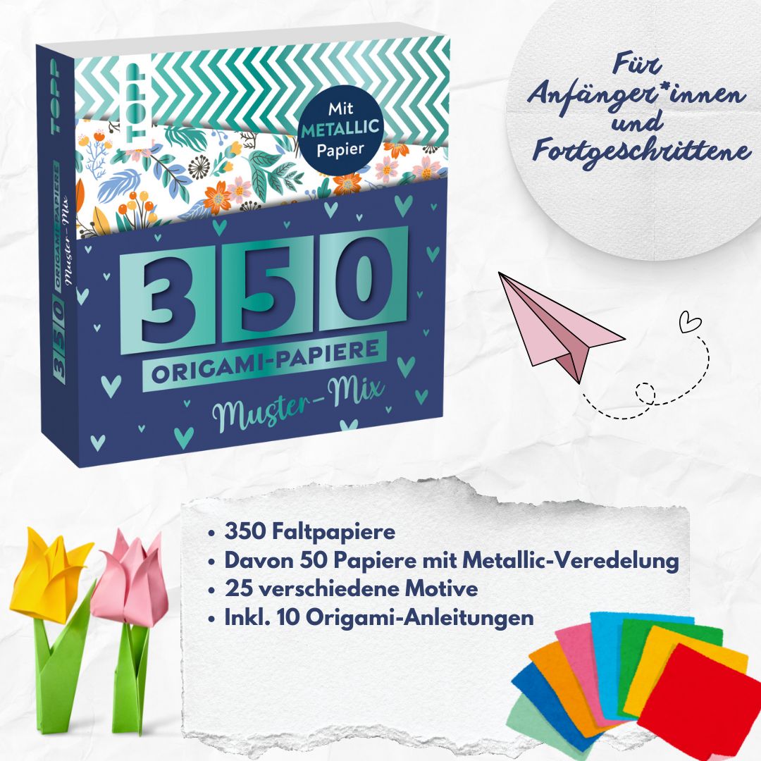 - 350 Falt-Papiere (14 x 14 cm, 80 g/m²), in 25 Designs