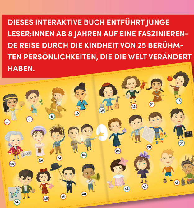 Dieses interaktive Buch entführt junge Leser:innen ab 8 Jahren auf eine spannende Reise durch die Kindheit von 25 berühmten Persönlichkeiten, die die Welt verändert haben. Egal ob Künstler, Erfinderin oder Bergsteiger - jeder von ihnen hat mal klein angefangen! Faszinierende Fakten und kurze Geschichten geben Hinweise und animieren zum Mitraten: Wer verbirgt sich wohl hinter der Klappe?