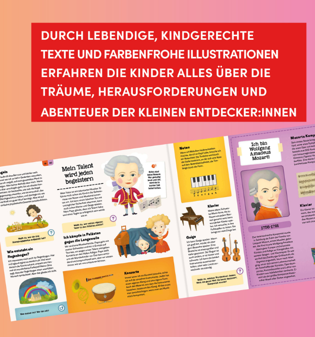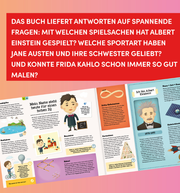 Von kreativen Köpfen wie Leonardo da Vinci bis hin zu klugen Wissenschaftlerinnen wie Marie Curie - durch lebendige, kindgerechte Texte und farbenfrohe Illustrationen erfahren die Kinder alles über die Träume, Herausforderungen und Abenteuer der kleinen Entdecker:innen. Das Buch liefert Antworten auf spannende Fragen: Mit welchen Spielsachen hat Albert Einstein gespielt? Welche Sportart haben Jane Austen und ihre Schwester geliebt? Und konnte Frida Kahlo schon immer so gut malen?