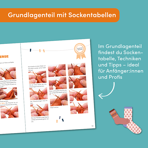 - Grundlagenteil mit Sockentabelle für die perfekte Orientierung zu Größen, Techniken und Garnwahl