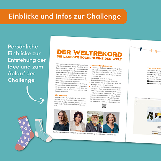 Begleite Susanne Oswald (bekannt durch die Roman-Reihe „Der kleine Strickladen in den Highlands“) und Veronika Hug (bekannt durch ihre beliebte Marke „Woolly Hugs“) auf ihrer mitreißenden Mission, gemeinsam mit unzähligen Strickfans einen Weltrekord im Sockenstricken aufzustellen!
