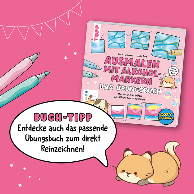 Entdecke auch das darauf abgestimmte Übungsbuch „Ausmalen mit Alkoholmarkern - das Übungsbuch” zum direkt Reinzeichnen!