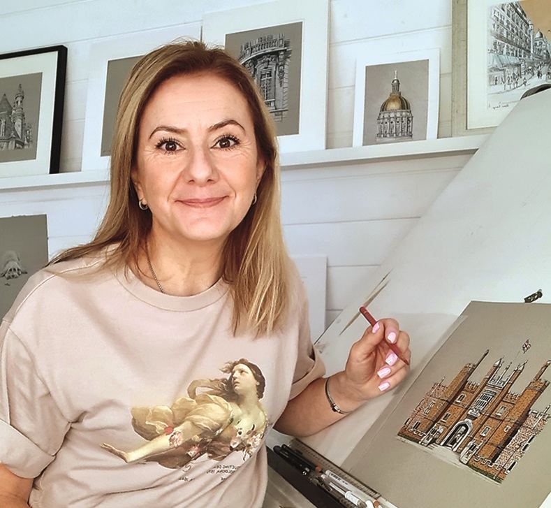 Demi Lang zeichnet seit über 20 Jahren Architektur und Gebäude. Ihre Arbeiten zeichnen sich vor allem durch ihren Detailreichtum und das Spiel mit Licht und Schatten aus, das den Gebäuden eine realistische Note verleiht. Dazu benutzt sie eine breite Palette von Materialien - von Bunstiften über Aquarell bis hin zu Blattgold. Die Künstlerin lebt und arbeitet in einem kleinen englischen Dorf in der Nähe von Oxford.