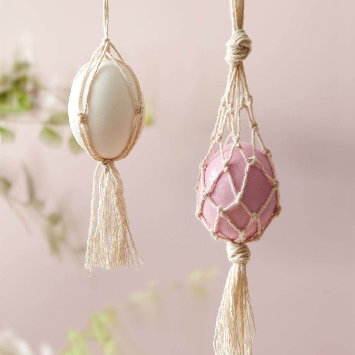 Für ein süßes Osternest eine flache Schale oder ein Korb mit Gras oder Heu füllen und die Eier hineinlegen. Mit Garn lassen sich wunderschöne Makramee-Dekorationen zaubern.