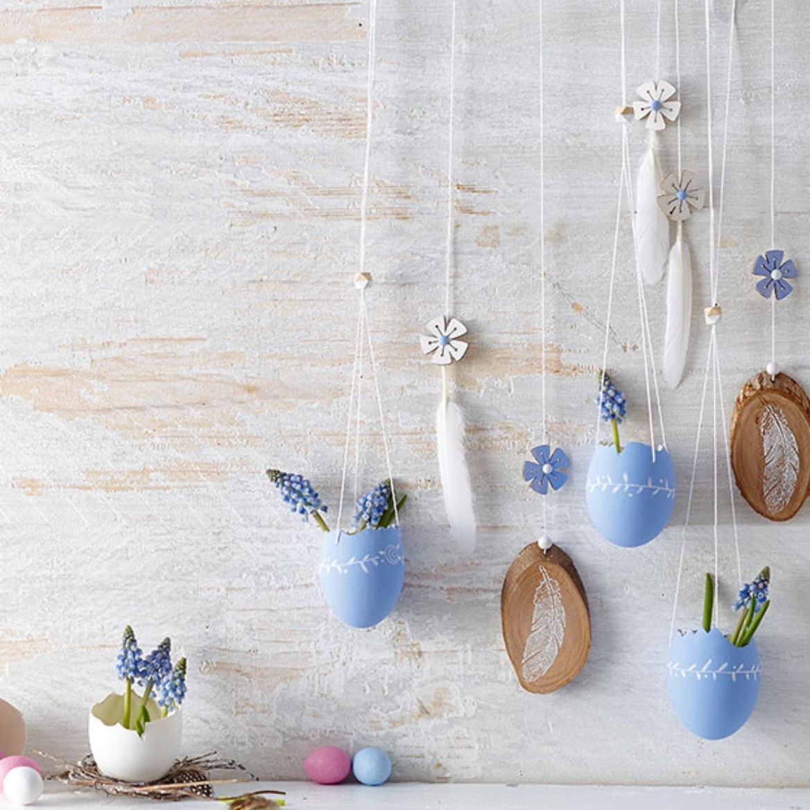 Natürlich gibt es noch viele weitere DIY- und Dekorationsideen. In Kombination mit Blumen, Holzscheiben und Federn lässt sich eine wunderschöne Osterdekoration zum Aufhängen oder Hinstellen kreieren.