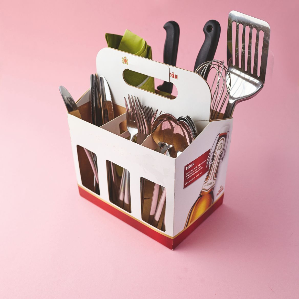 Ein Flaschenträger aus Pappe ist ein toller Korb für Besteck,