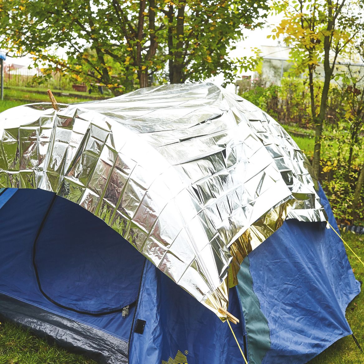 Spann einfach die Rettungsdecke über dein Zelt, mit