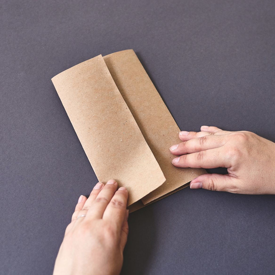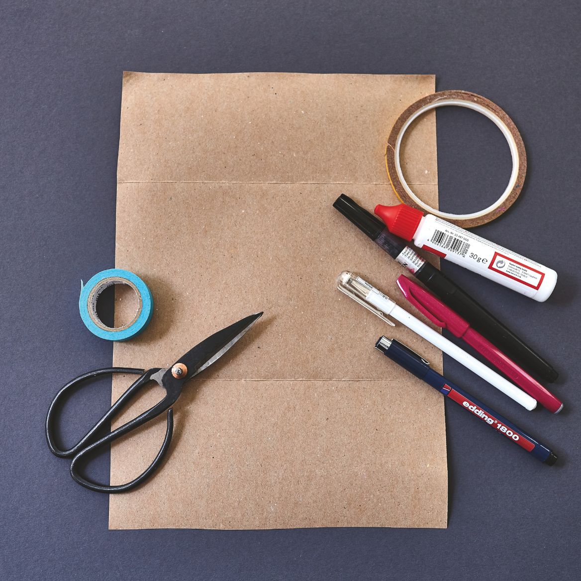 Du benötigst: Kraftpapierzuschnitt, Klebstoff oder doppelseitiges Klebeband, Washi Tape, Brush Pens, Gelstifte oder Fineliner