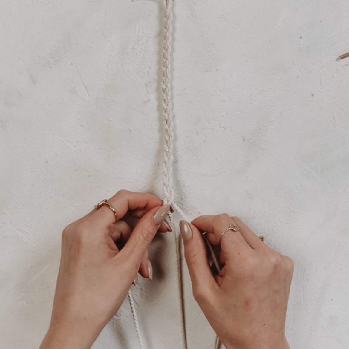 Schneide das Makramee-Garn in 3 jeweils 2 m lange Stücke und flechte die Fäden zu einem langen Zopf.