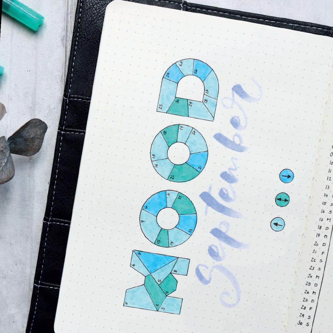 Lege das Heft quer vor dich hin, denn dieser Mood Tracker wird wird im Querformat angelegt. Das Wort „MOOD” selbst wird hier zum Tracker gemacht.