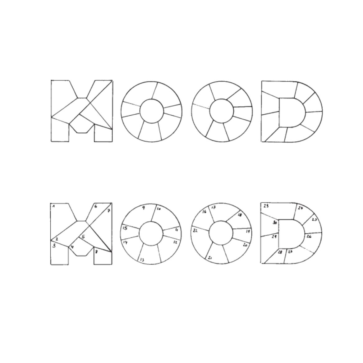 Teile die Buchstaben frei in mehrere Teile ein wie bei einem Mosaik.