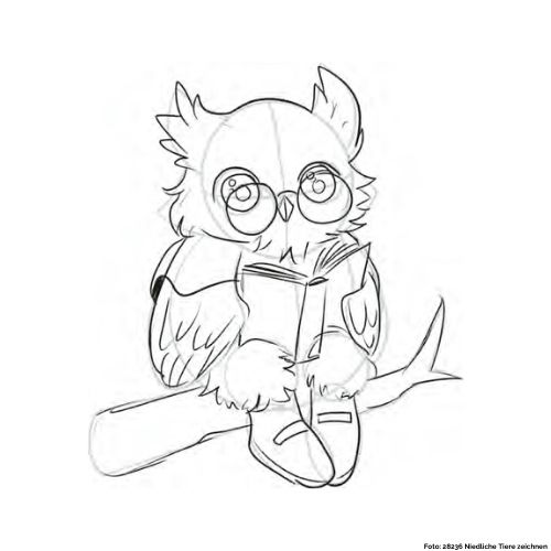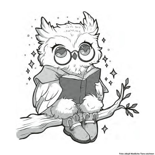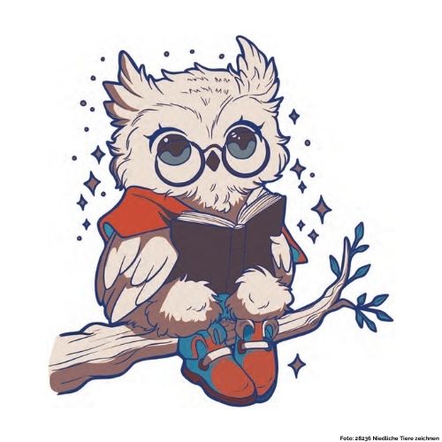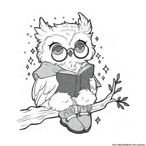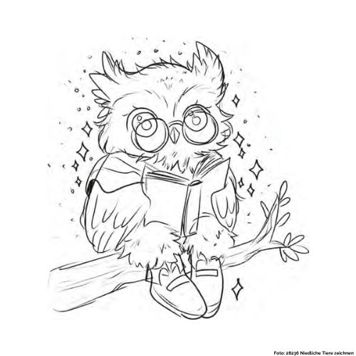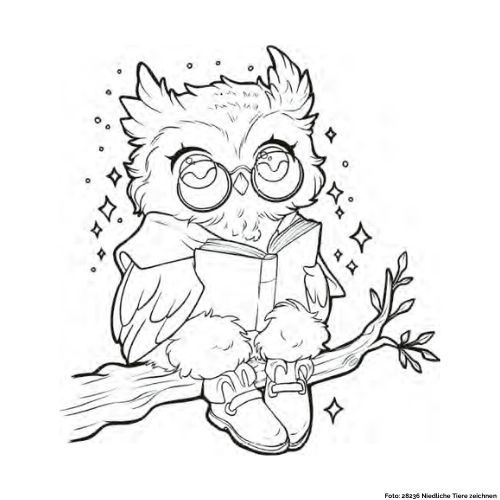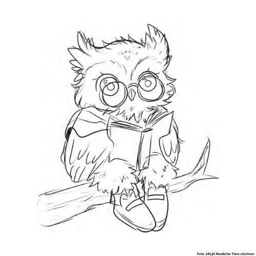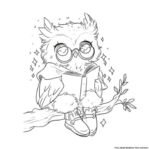 In dieser Zeichnung stellen wir euch eine Eule vor, die auf einem Ast sitzt und ein Buch liest.