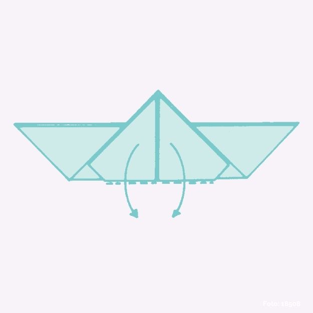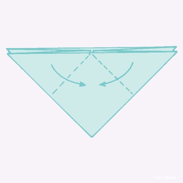 Die beiden Spitzen an der gestrichelten Linie nach unten falten und vorsichtig die beiden dreieckigen Winkel glatt streichen, die an beiden Seiten entstehen.