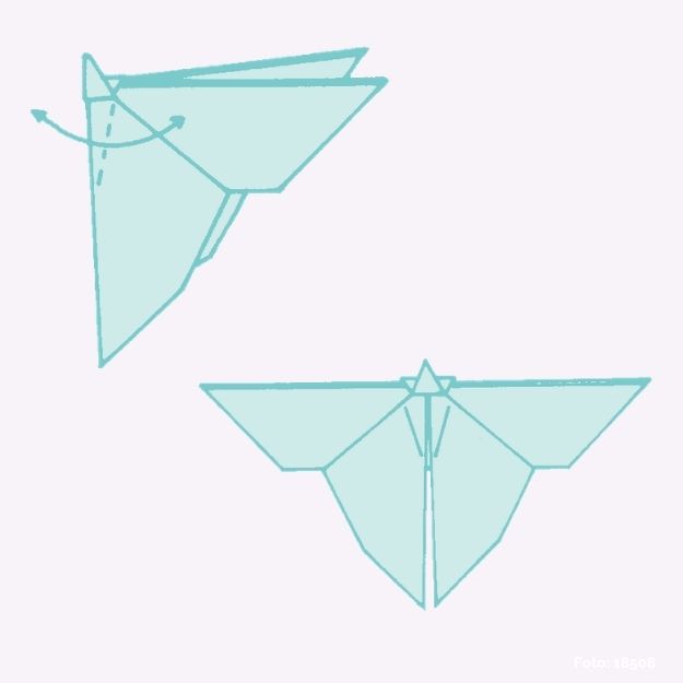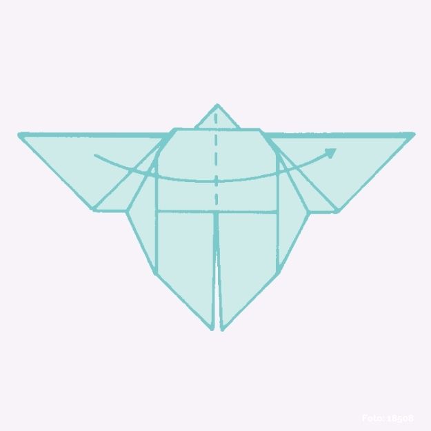 Um den Rumpf zu formen, die Flügel an der gestrichelten Linie nach vorne bzw. nach links und wieder zurück falten.