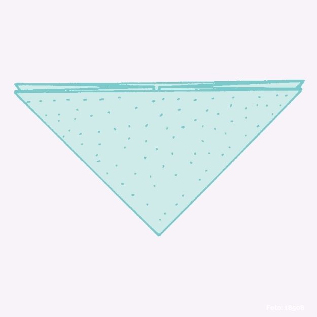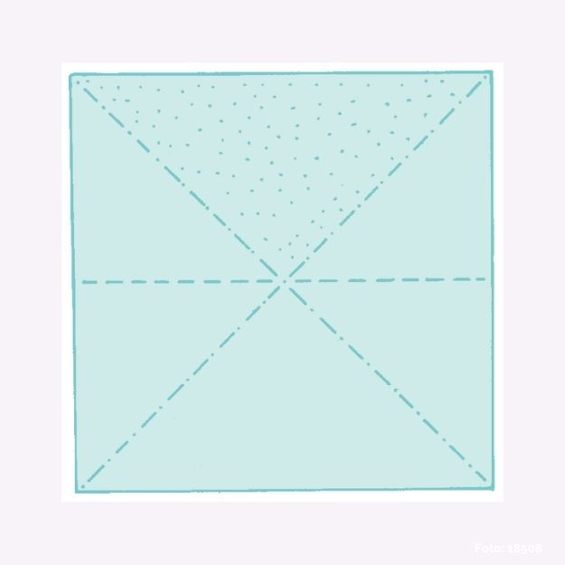 Die obere Spitze an der Strichpunktlinie nach hinten und an der gestrichelten Linie wieder nach vorne falten.