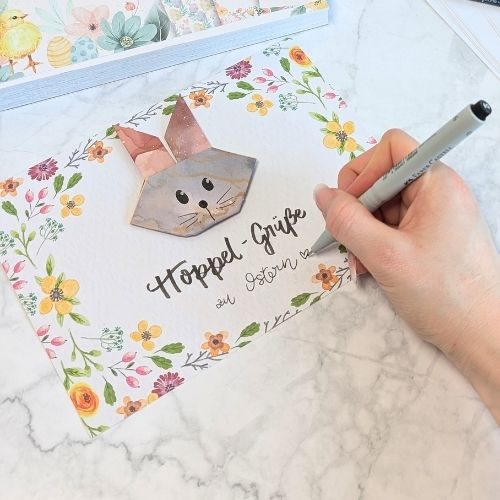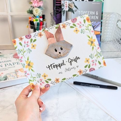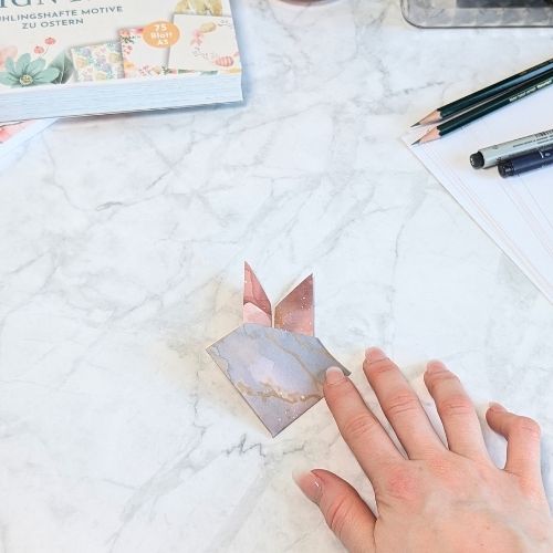 Jetzt geht es los. Wir zeigen dir Schritt für Schritt, wie du einen Osterhasen aus Origami faltest und die Osterkarte noch verschönern kannst.