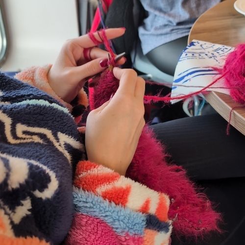 Die Stricker:innen kommen ins Gespräch, tauschen sich aus und helfen sich bei verstrickten Maschenproblemen.