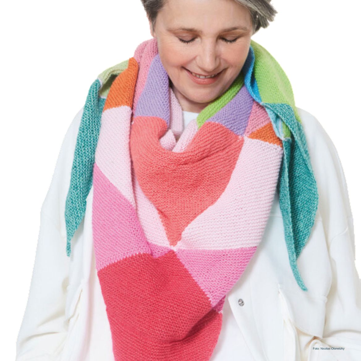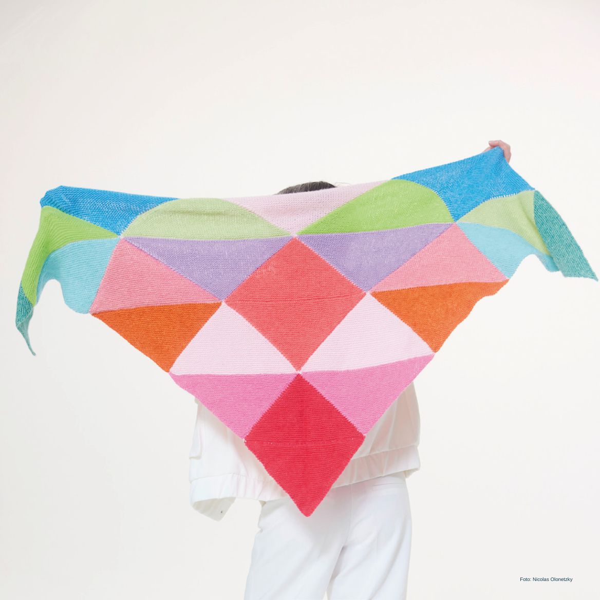 Das fertige Umarmungstuch besteht aus 25 Dreiecken aus hochwertiger Merinowolle von Lana Grossa.