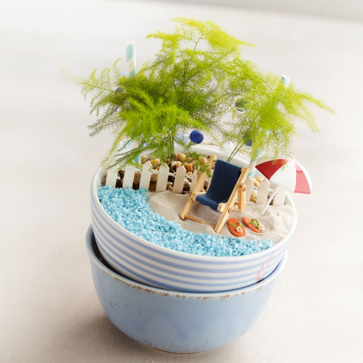 Den letzten Feinschliff erhält der Strand mit dem Sonnenschirm, der Liege und den Mini-Sandalen.