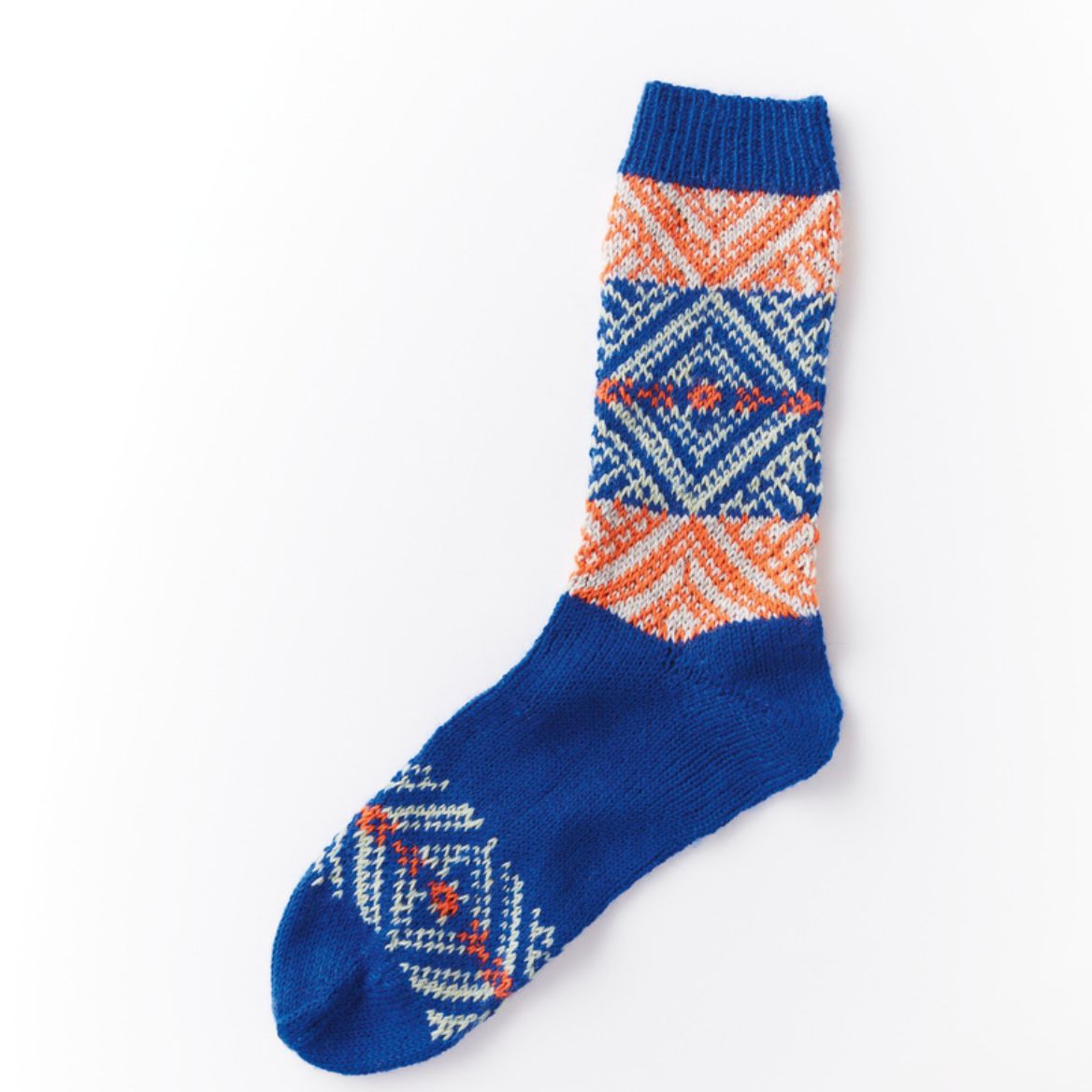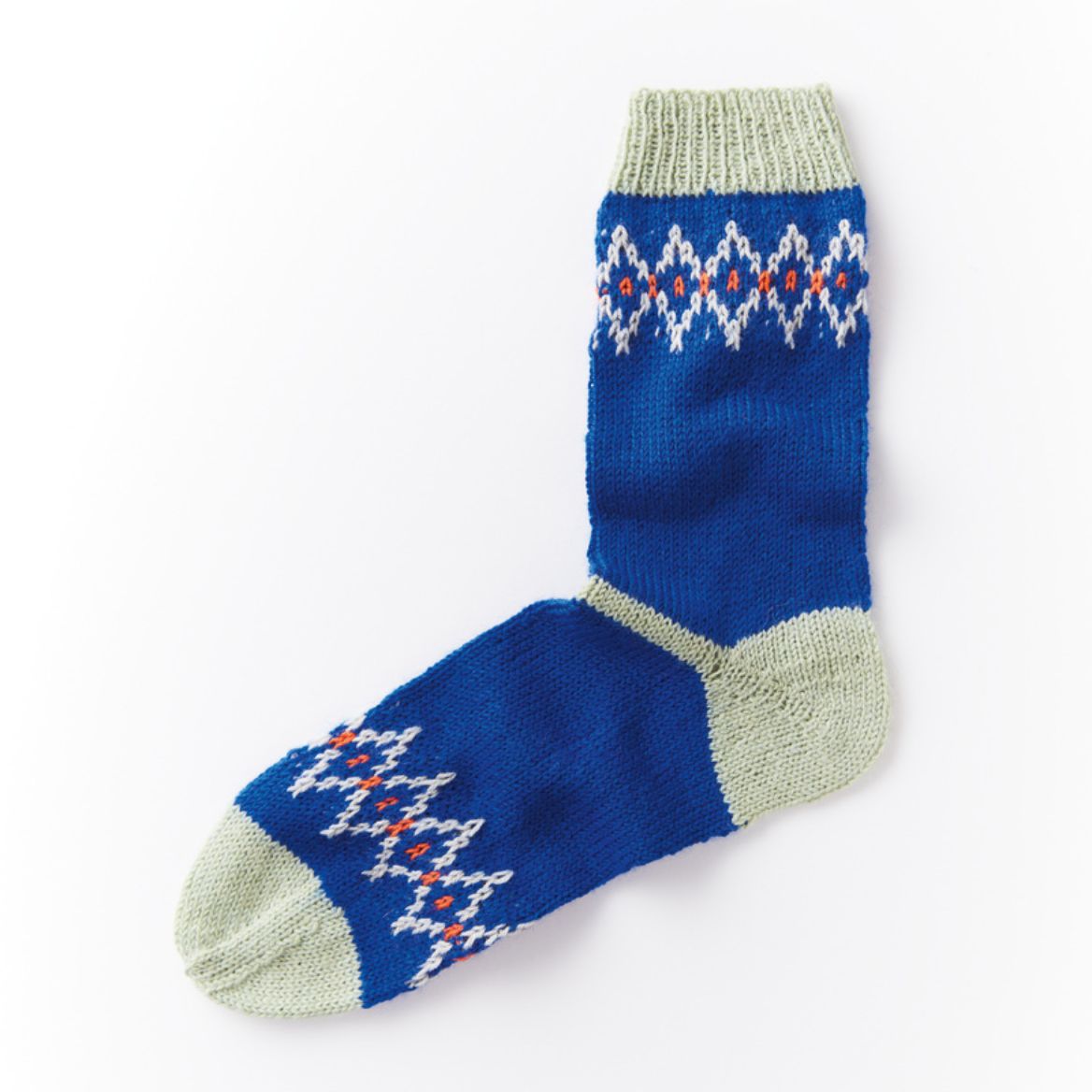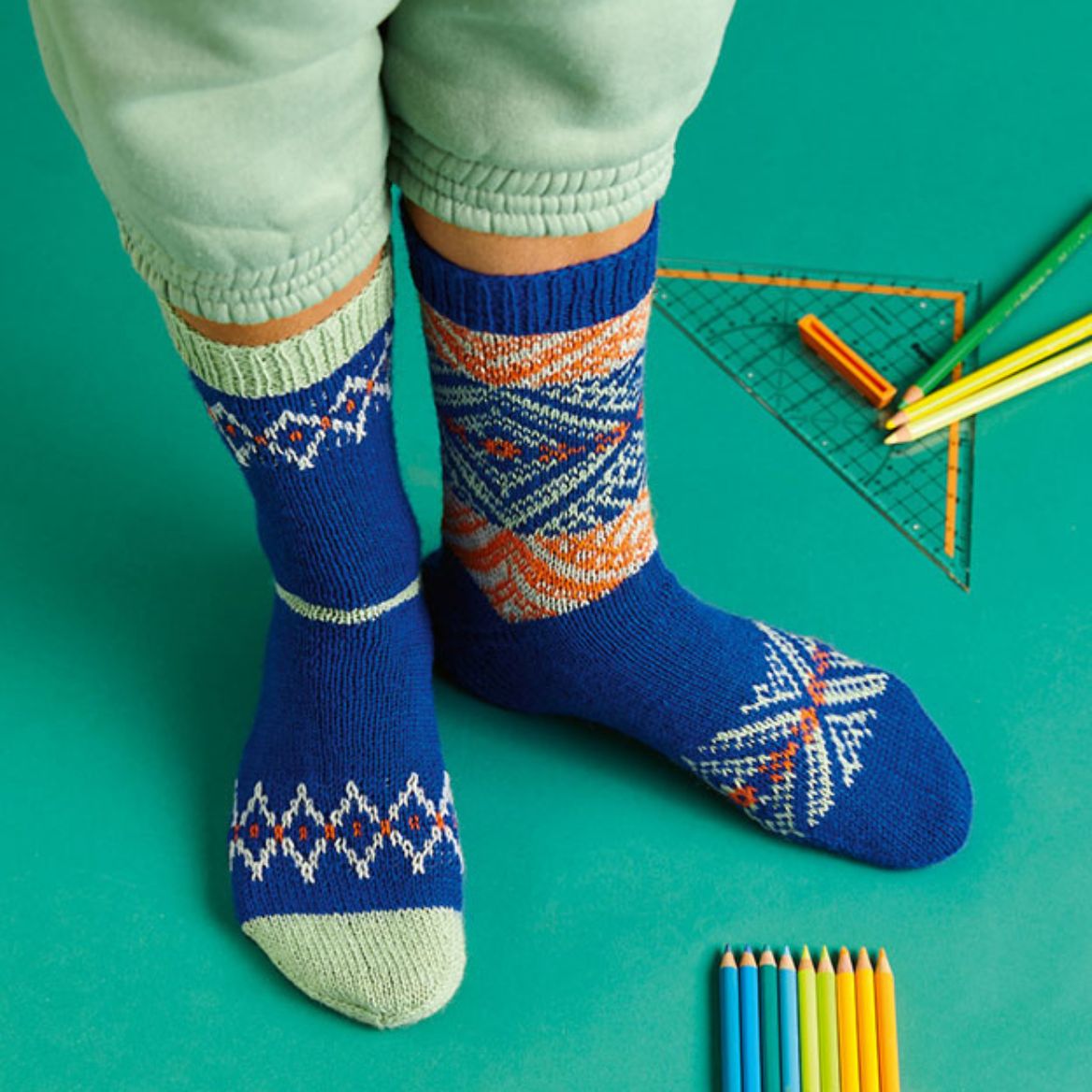 Den Fuß in Royal bis zu einer Länge von 14/15 cm stricken, dann weiter die 15.-45. Rd des Zählmusters stricken. Die Fäden in Salbei und Mandarine abschneiden.