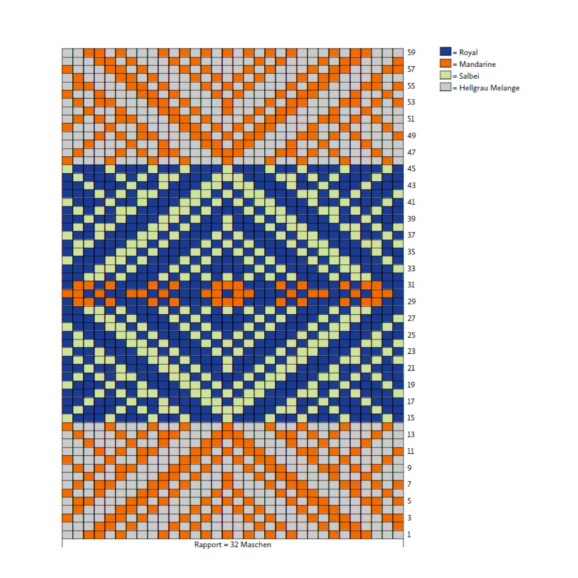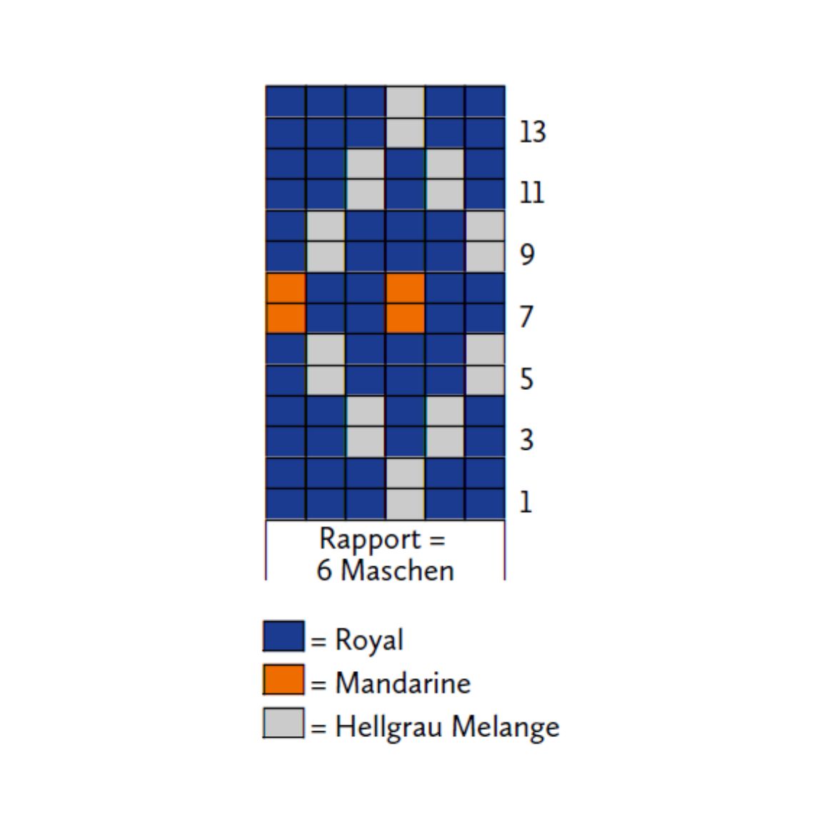 Den Schaft glatt rechts in Jacquardtechnik nach dem Zählmuster arb. Die 1.-59. Rd 1x str. Die Fäden in Mandarine, Salbei und Hellgrau Melange abschneiden. In Royal 1 Rd glatt rechts stricken.