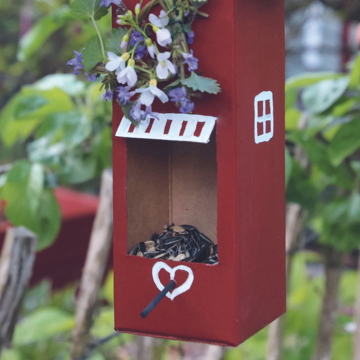 Dieses Vogelhäuschen ist eine tolle Upcycling Idee, denn aus einem alten Getränkekarton wird so ein Futterhaus. Willst du es in deinem Garten aufhängen?