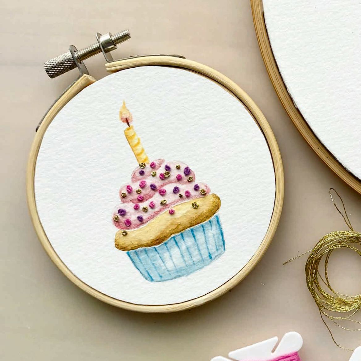 Lerne, wie du Watercolor Bilder bemalst & bestickst – ganz ohne Vorkenntnisse. Los geht’s mit deinem "Cupcake Motiv".