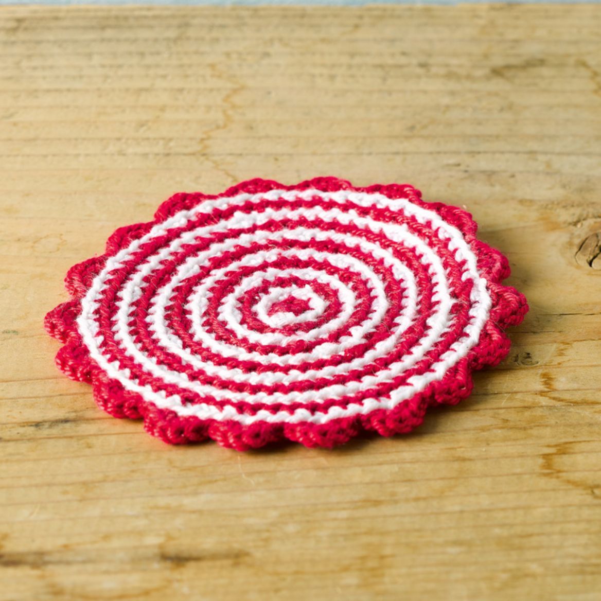 1 Rd in Weiß und 1 Rd in Feuerrot im Wechsel häkeln.