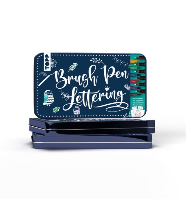 Die hochwertige Metalldose enthält 6 Brush Pens in angesagten Grundfarbtönen. Dazu gibt es 5 wunderschöne Design Paper Karten zum Loslettern.