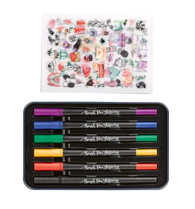 Dose (19 x 11,5 cm), 6 Brush Pens mit Fineliner-Spitze in Rot, Gelb, Grün, Lila, Blau, Schwarz, 5 Design Paper, 2 Transferstickerbogen