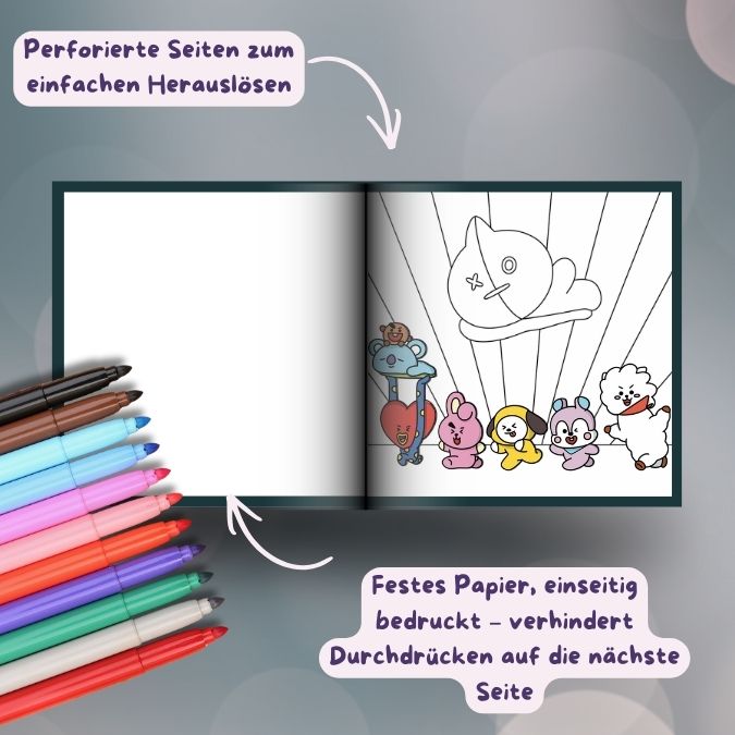 Die liebevoll gestalteten Motive sind auf festem Papier gedruckt und lassen sich dank Perforation einfach herauslösen. Die verlängerte feste Buchklappe schützt deine Arbeiten und verhindert ein Durchdrücken der Stifte. Auf den ersten Seiten findest du Platz, um Stifte und Farbkombinationen zu testen – perfekt für einen entspannten Ausmalnachmittag mit K-Pop-Feeling!