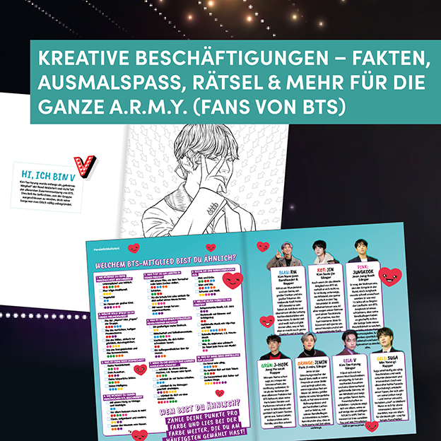 In diesem SUPER FAN-tastischen Kreativbuch erwarten dich über 35 Ausmal-Seiten, spannende Tests zu deinem Fan-Wissen sowie lustige und herausfordernde Spiele und Rätsel. Von Finde-den-Unterschied-Bilderrätseln über Wortsuchen bis hin zu kniffligen Aufgaben – alles dreht sich um BTS und ihre Bandgeschichte. Zusätzlich bekommst du interessante Fakten zu jedem Bandmitglied und zur Entwicklung der Band – perfekt für alle, die BTS lieben und mehr über ihre Idole erfahren möchten.