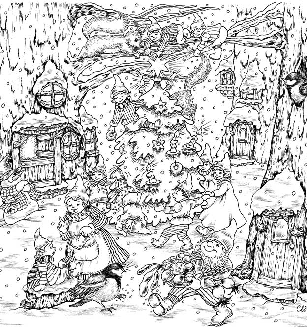 In über 80 großen und kleinen Illustrationen begleiten wir die kleinen Wichtel bei all ihren Abenteuern. Egal ob bei der lustigen Schlittenfahrt, beim Schmücken des Weihnachtsbaums in der gemütlichen Stube oder bei der Weihnachtsbäckerei: Alle liebevoll handgezeichneten Illustrationen stammen aus der Feder der schwedischen Illustratorin Christl Vogl. Begleitet werden die Zeichnungen von kleinen Geschichten, die vom Leben der Weihnachtswichtel berichten. Während des Ausmalens kannst du dich so ganz in die fantastische Welt hinein träumen und wenn du möchtest, die Geschichten auch selbst weiterspinnen.