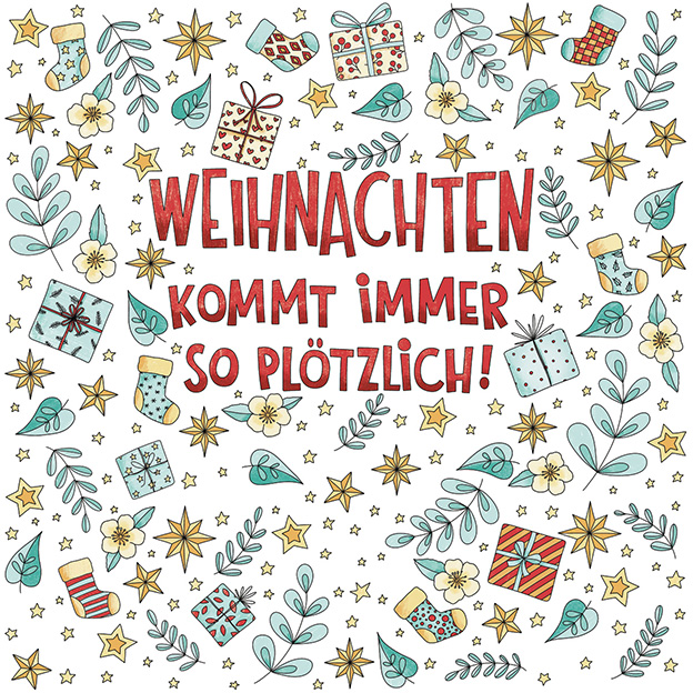 Weihnachten kommt immer so plötzlich! Um die schönste Zeit des Jahres ein wenig bewusster wahrzunehmen, bietet dieser Adventskalender täglich einen humorvollen oder unterhaltsamen Spruch zum Ausmalen. Die frischen Sprüche sind im Handlettering-Stil gezeichnet und umringt von thematisch passenden Streumustern. Die 24 Türchen sind als zunächst geschlossene Doppelseiten gestaltet, die sich dank Perforation einfach öffnen lassen. Zur Inspiration findest du die Ausmalmotive auf den linken Seiten schon beispielhaft bunt gestaltet.