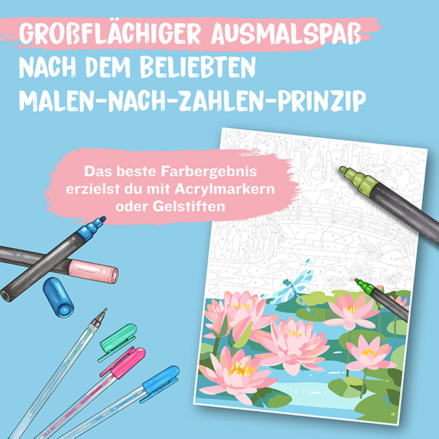 Mit Acrylmarkern erreichst du ein besonders leuchtendes Farbergebnis, das die grau gedruckten Zahlen problemlos abdeckt, aber auch andere Stifte und Farben eignen sich hervorragend.