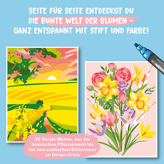 Erkunde mit dem Stift die floralen Motive, von klassischen Blumen wie Rosen und Dahlien, bis zu atemberaubenden Orten, die für ihre Blütenpracht bekannt sind, wie der Garten des Malers Claude Monet oder die farbenfrohen Weiten des japanischen Blumengartens Shikisai Hill.