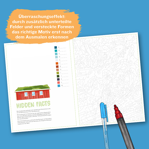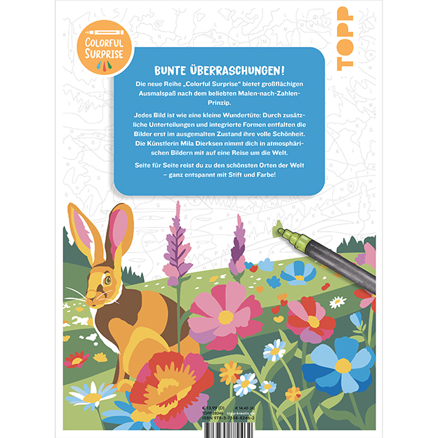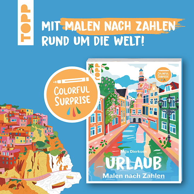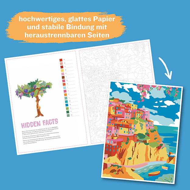 Entdecke dein nächstes Reiseziel mit den traumhaften Urlaubs-Motiven in diesem Malen-nach-Zahlen-Ausmalbuch. Die neue Reihe „Colorful Surprise“ bietet großflächigen Ausmalspaß nach dem beliebten Malen-nach-Zahlen-Prinzip. Jedes Bild ist wie eine kleine Wundertüte: Durch zusätzliche Unterteilungen und integrierte Formen entfalten die Bilder erst im ausgemalten Zustand ihre volle Schönheit.