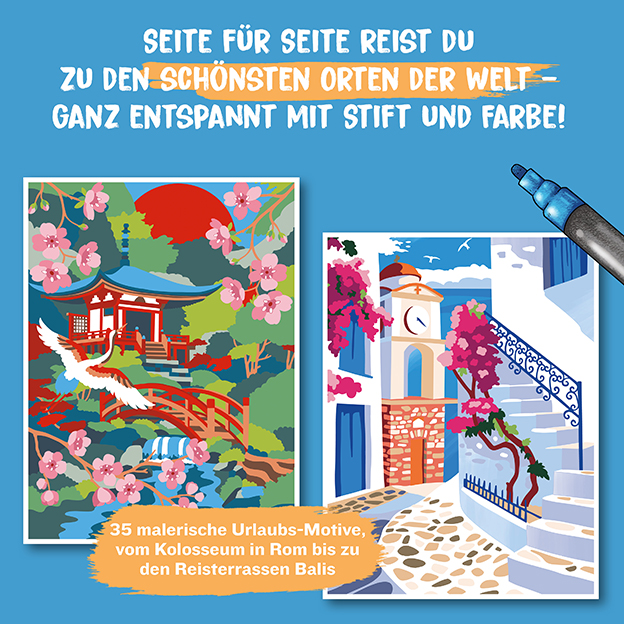 Seite für Seite reist du zu den schönsten Orten der Welt – ganz entspannt mit Stift und Farbe!