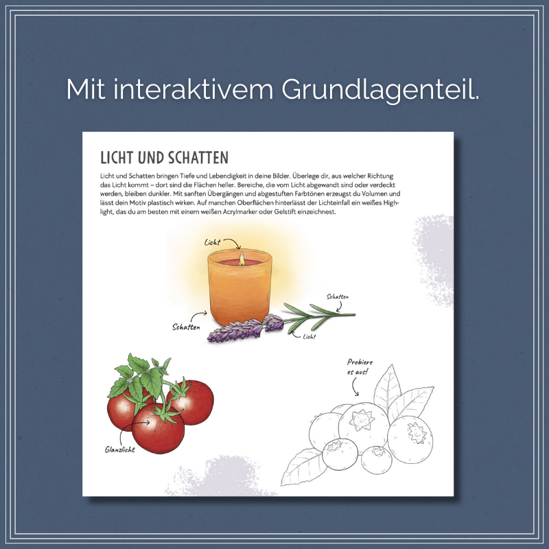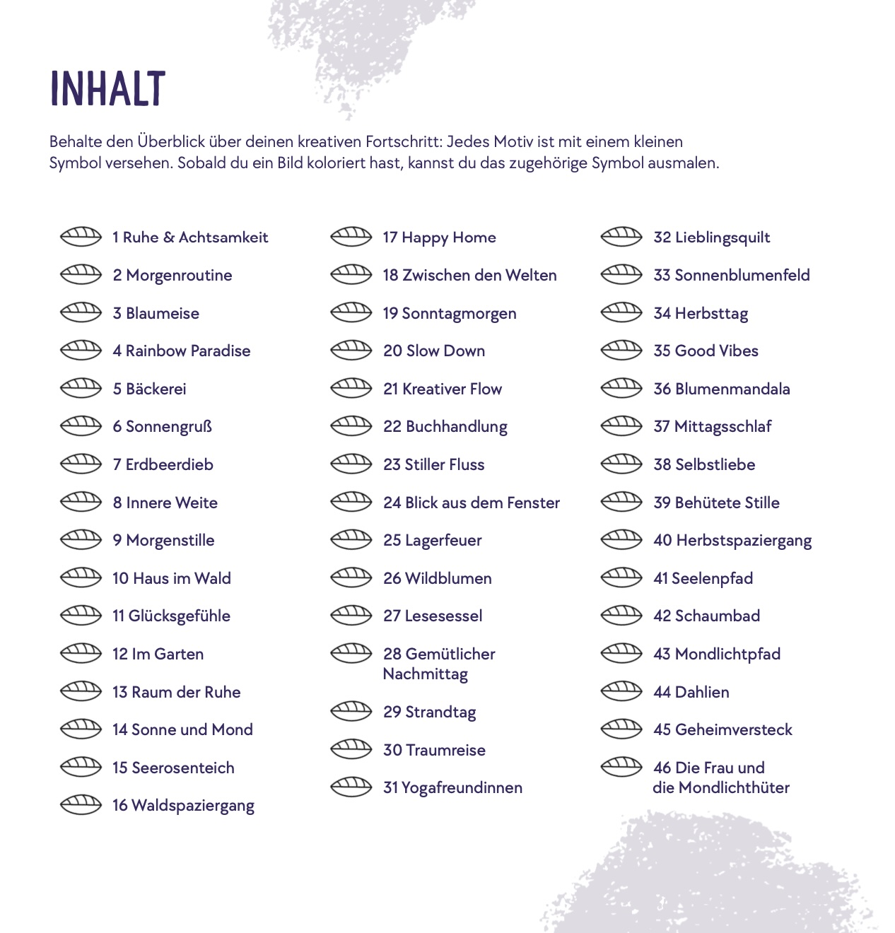 Über 80 Illustrationen warten darauf, von dir entdeckt und gestaltet zu werden. Vier Künstlerinnen mit unterschiedlichen Zeichenstilen haben das Thema facettenreich interpretiert und die kleinen und großen Ausmalmotive liebevoll handgezeichnet. Begleitend findest du auf den linken Seiten inspirierende Sprüche, die dir kreative Gedankenimpulse schenken. Der interaktive Grundlagenteil ist der perfekte Einstieg für deine entspannte Pause und bringt dir die wichtigsten Basics näher.
