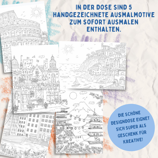 Diese schön gestaltete Metalldose enthält 12 Premium-Buntstifte in tollen Farben mit besonders weicher Miene. Außerdem sind 5 handgezeichnete Ausmalmotive zum sofort Ausmalen enthalten. Die schöne Designdose eignet sich super als Geschenk für Kreative!