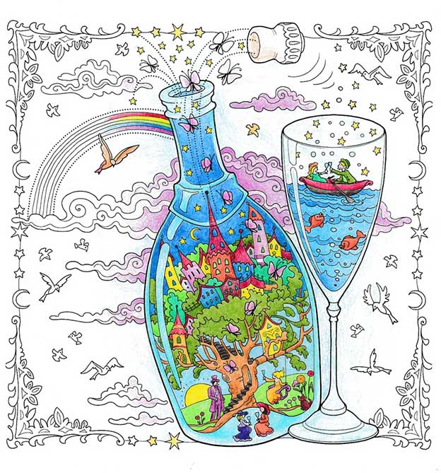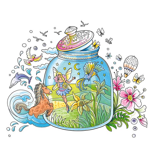 Begib dich auf ein außergewöhnliches Ausmal-Abenteuer und entdecke die Geheimnisse der Miniaturwelten im Glas!