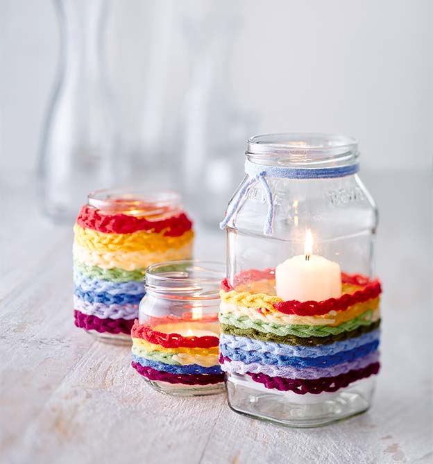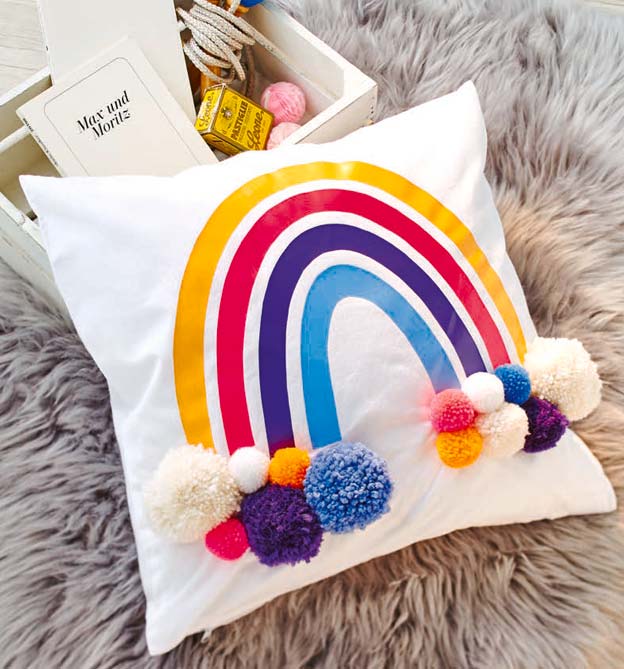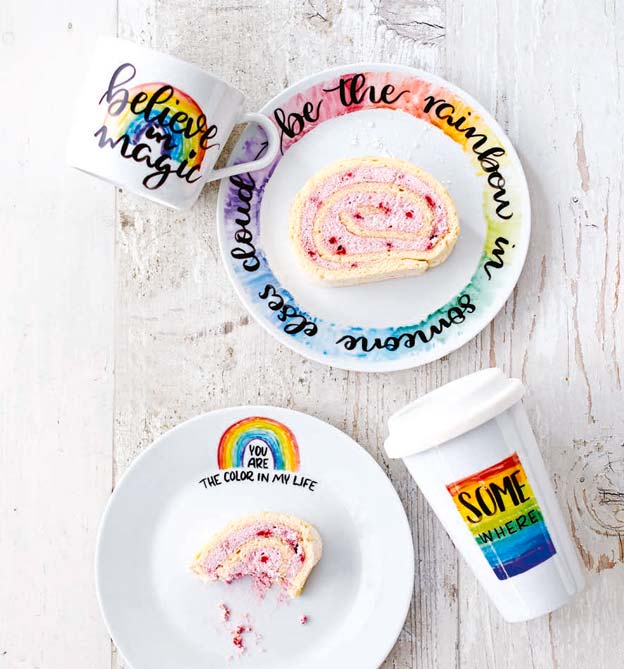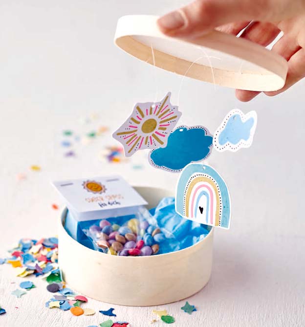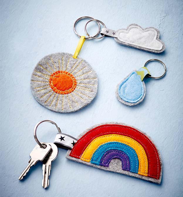 Lettering auf Porzellan, Regenbogenkissen mit Pomponwolken, Fußmatte, Haarreifen, Schlüsselanhänger aus Filz, bestempeltes Geschenkpapier, Windlichter mit Luftmaschenketten, Geschenkbecher, Tütchen mit Etikett, Geschenkbox, Glückssteine, Wolkenpinnwand mit bunten Regentropfenpins, Karussell, ein genähtes Täschchen mit einem Reißverschluss, PopUp-Karte, geflochtener Schmuck, gewebte Papierkörbchen, Fliegenschutz-Deckel für Trinkgläser aus Bügelperlen, Blumenkasten, Kerzen, Papiergirlanden.