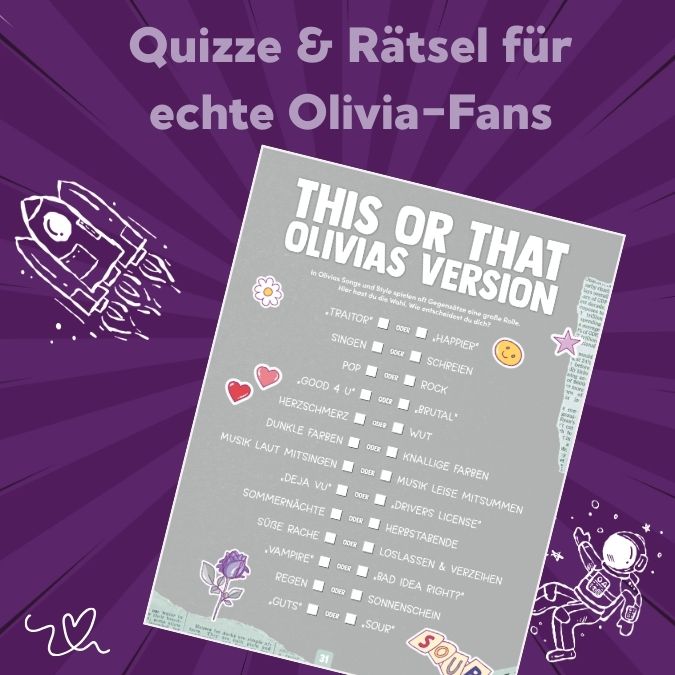 - spannende Rätsel, Quizze & Challenges rund um Olivia Rodrigo und ihre Musik