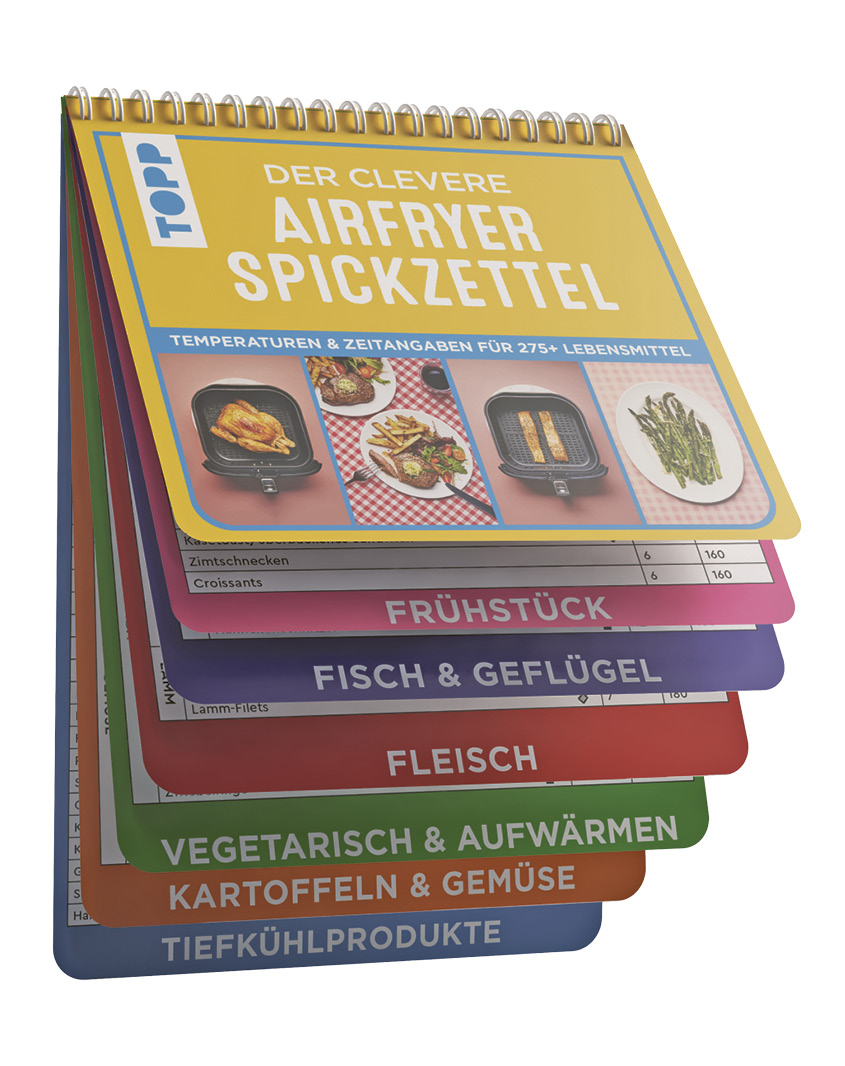 Nie wieder rätseln, wie lange Hähnchen, Pommes oder Fisch im Airfryer garen müssen! Dieser praktische Spickzettel liefert Ihnen die empfohlenen Garzeiten und -temperaturen für die gängigsten Zutaten – von Pommes, Bratkartoffeln und Steak bis zu Tiefkühlkost – sofort griffbereit. Das übersichtliche Flipchart-Design macht das Auffinden des gewünschten Lebensmittels ganz easy und dank des Magnetstreifens lässt sich der Spickzettel direkt am Kühlschrank befestigen. Laminierte, robuste Seiten schützen vor Fettspritzern und Feuchtigkeit.