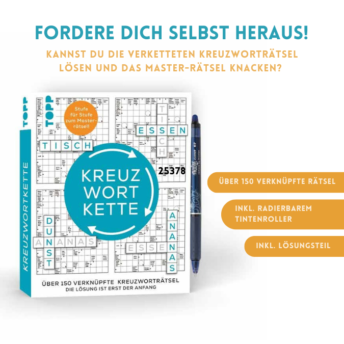 Kannst du die verketteten Kreuzworträtsel lösen und das Master-Rätsel knacken? Der Rätsel-Klassiker mit neuem Kniff: In dieser Kreuzwortkette gibt dir die Lösung eines Rätsels den Anfang für das nächste. Knoble dich durch Seite für Seite bis zum Master-Rätsel!