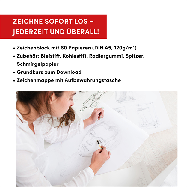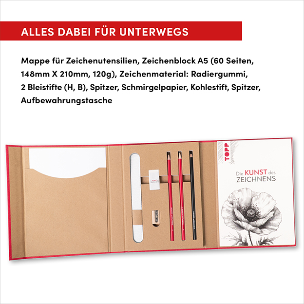 In dieser Mappe ist alles enthalten, was du zum Zeichnen brauchst: Bleistift, Kohlestift, Radiergummi, Spitzer, Schmirgelpapier sowie ein A5 Zeichenblock. Die Mappe lässt sich durch ihre kompakte Form überallhin mitnehmen, so dass du an jedem Ort deiner Kreativität freien Lauf lassen kannst. Durch den integrierten Grundkurs kannst du neue Zeichentechniken entdecken und weiterentwickeln.