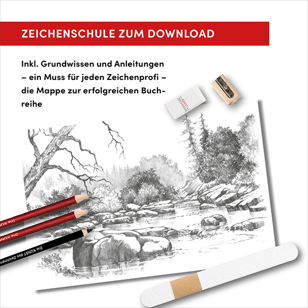 - Zubehör: Bleistift, Kohlestift, Radiergummi, Spitzer, Schmirgelpapier