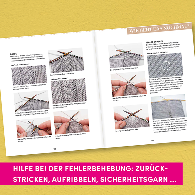 - Hilfe bei der Fehlerbehebung: Zurückstricken, Aufribbeln, Sicherheitsgarn u. v. m.