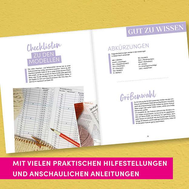Im Grundlagenteil werden alle benötigten Techniken erklärt. Die Basismaschen solltest du allerdings schon beherrschen. Die Anleitungen sind einfach, übersichtlich und durch die vielen Schritt-Fotos besonders leicht verständlich, damit das Nacharbeiten ohne Frust gelingt. Eine große Hilfe sind viele Detailfotos für die kniffligen Stellen sowie zahlreiche Tipps und Hinweise. Schnittskizzen mit Strickrichtung und Maßen veranschaulichen das Design und machen das Vorgehen nachvollziehbar. Und wenn mal etwas schief gegangen ist, dann bitte keine Panik! Zahlreiche Tipps zur Fehlerbehebung sorgen für schnelle Lösungen und beheben das Problem im Handumdrehen. Besonders praktisch sind die enthaltenen Zähltabellen zum Abhaken sowie der Spickzettel zum Herunterladen. So bewahrst du zu jedem Zeitpunkt den Überblick und die Orientierung.